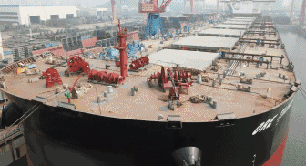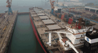 昨天上午,我国制造的世界最大矿砂船——新一代超大型40万吨矿砂船在青岛下水。这标志着该船的船体结构已完成建造,接下来将进行船体电器设备安装和相关性能测试等收尾工作。该型矿砂船总共将建造30艘,分由国内四家船厂制造,主要用于巴西-中国航线的铁矿石运输。