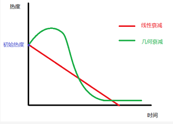 我们要求推荐给用户的新闻必须是24h以内,所以理论上讲,衰减算法必须保证在24h后新闻的热度一定会衰减到很低,如果是线性衰减,当某些新闻突然有大量用户阅读,获得很高的热度分时,可能会持续排名靠前很久,让用户觉得内容更新过慢。