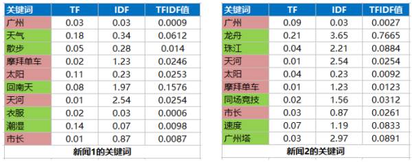 可以看到两条新闻有5个重合的关键词:广州,摩拜单车,太阳,天河和市长,因此两条新闻的相关性由这5个关键词决定,计算方式如下: