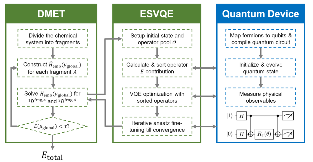 针对这一问题,字节跳动 AI Lab Research 团队联合清华大学化学系帅志刚课题组、中科院计算所孙晓明课题组、北京大学袁骁课题组和牛津大学孙金钊博士提出了利用密度矩阵嵌入理论 (Density Matrix Embedding Theory, DMET) 结合能量排序 VQE (energy-sorting VQE, ESVQE),减少分子体系模拟所需要的比特数和线路深度,