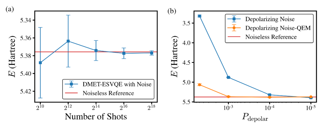 为了进一步测试 DMET-ESVQE 在真实量子硬件上的表现,作者进一步使用了带噪声的数值模拟器针对一维氢链体系进行了基准测试。结果表明 DMET-ESVQE 的结果随测量次数快速收敛,且使用误差缓解之后退极化噪声的影响也可以得到有效控制。