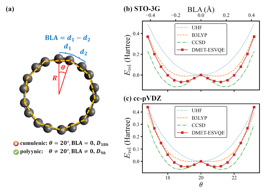 随后,作者将该算法应用于 C6H8 的氢化反应和 C18 分子的平衡几何结构。数值测试发现 DMET-ESVQE 可以高精度地模拟化学反应势垒,且正确预言 C18 分子的平衡几何结构,与此同时, DMET-ESVQE 可以将 VQE 所需的量子比特数目减少一个数量级。