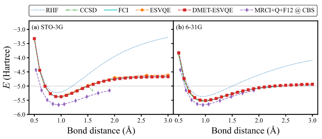 为验证这一算法的有效性,作者进行了一系列数值模拟测试。首先,在一维氢链 H10 的基准测试体系中,作者发现 DMET-ESVQE 可以达到与精确解 Full CI 相仿的精度。