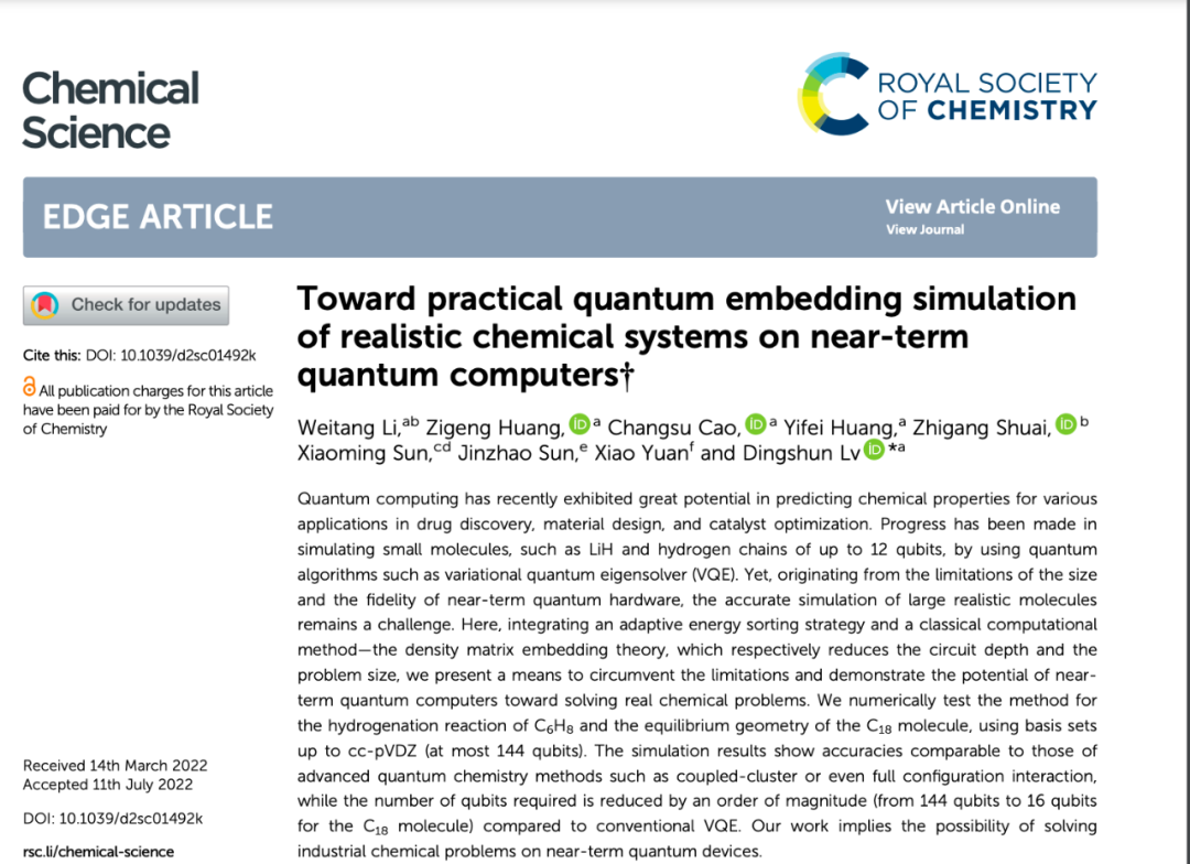 化学、材料体系的模拟很可能会成为量子计算机最先颠覆的行业。变分量子特征值求解算法 (variational quantum eigensolver, VQE) 在近期含噪声中等规模器件上表现出应用于化学模拟的巨大潜力。2020 年,Google 公司利用 “悬铃木” 量子芯片实现了二亚胺 (N2H2) 异构化反应过程的量子计算,相关成果发表于《Science》杂志。然而,近期可实现的量子硬件的尺寸和保真度仍然面临着明显的限制,这对利用量子计算机模拟更加真实的化学、材料体系提出了挑战。