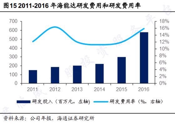 海能达能在国际市场上势如破竹,靠的就是对研发大规模、长时间的投入,研发投入长期维持在10%以上,近年来还有加速上升的态势,2016年已经去到了16%。