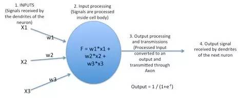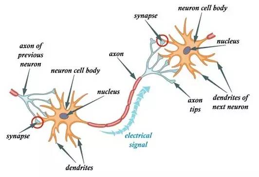 在我们的大脑中,有数十亿个称为神经元的细胞,它们以电信号的形式处理信息。神经元的树突接收来自外部的信息或刺激,并在神经元细胞体进行处理,将其转化为输出并通过轴突传到下一个神经元。下一个神经元可以选择接受或拒绝它,这主要取决于信号的强度。