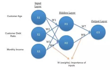 5.权重W是与输入相关联的重要点。如果W1是0.56,W2是0.92,那么在预测H1时,X2:债务比率比X1:Age更重要。