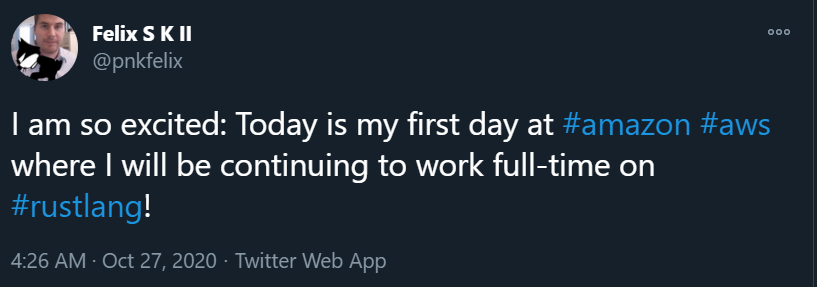 Felix Klock 主要致力于 Rust 编译器、运行时库和语言设计相关工作。在入职 AWS 之前,他是 Mozilla(开发 Firefox 浏览器的公司)的一名研究工程师。2010 年,他在美国东北大学拿到了计算机科学博士学位。同年 3 月,他加入了 Adobe 担任计算机科学家,致力于 ActionScript 虚拟机的开发。2012 年,Klock 离开 Adobe,加入 Mozilla。今年 8 月,Mozilla 宣布进行大裁员,Felix Klock 也在这个月离职。今年 10 月份,Klock 宣布自己加入 AWS,继续全职开发 Rust。