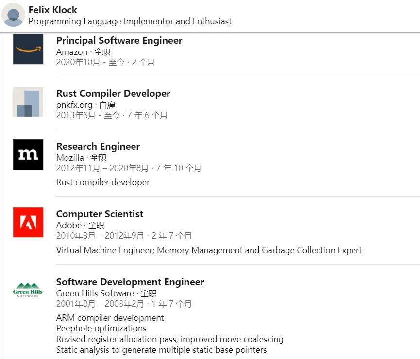 据领英公开资料显示,Felix Klock 于今年 8 月离开 Mozilla,之后于 10 月入职 AWS,担任首席软件工程师。