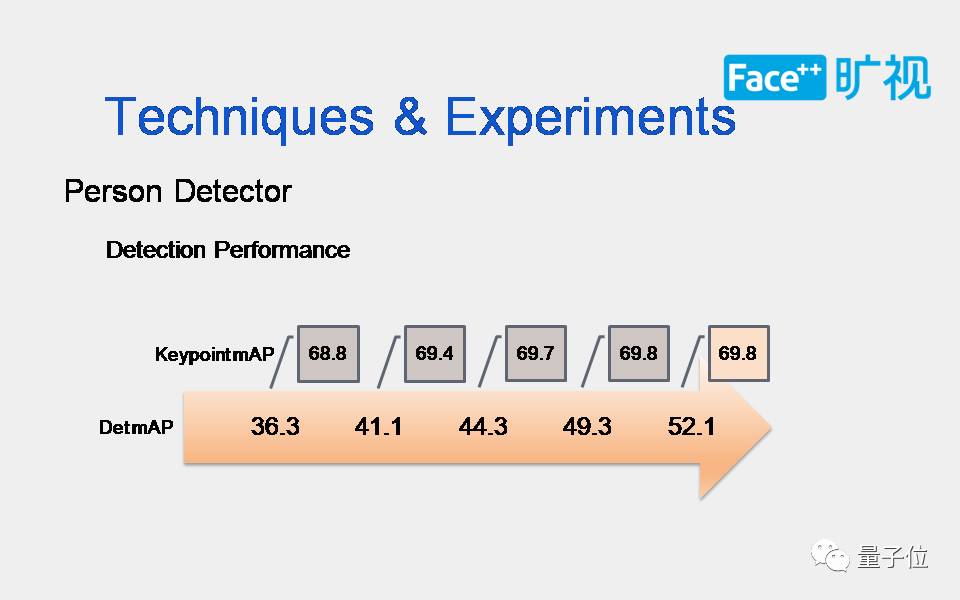 我们有关detection的这组实验室从detectionAP 36.3开始到52.1。52.1是今年冠军的水平,36.3目前属于一般水平,44.1属于是平均水平。我们在36.3的detection mAP上是68.8,41.1的是69.4,44.3的是69.7,也就是说到后来在detection mAP有明显提升的情况下,在keypoint mAP上基本没有提升。
