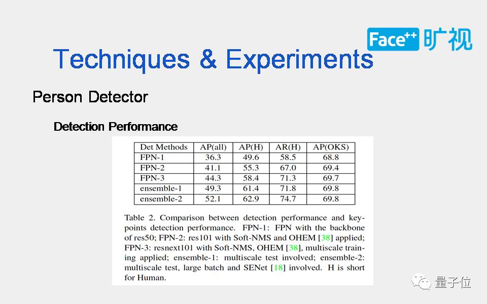 我们用的检测框来自于我们detection team,而旷视研究院detection这一次也是拿了COCO的第一名,分数很高。所以在这里我们有必要分析下detection AP对Keypoint AP有多大影响。