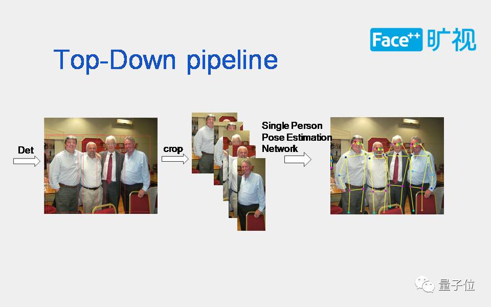 现在我们做Pose Estimation主要有两种Pipeline,这次比赛使用的是Top-down Pipeline:先用detector检测出图象中的人,再把每一个人的图像抠图,抠出来的单人的图过single person Pose Estimation Network(即单人姿态估计网络),最后把所有的单人估计出来的姿态,整合到原图中,得到最终结果。