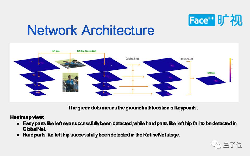 这张图上,热力图可以体现出我们的网络设计原理,图上的绿点是关节点对应的ground truth。从图中左边的部分可以看出左眼作为相对容易的关节点,在前阶段的全局网络就可以解的很好。而右边的左臀部,作为相对较难的遮挡点,需要在后面的精炼网络里面才能识别出来。