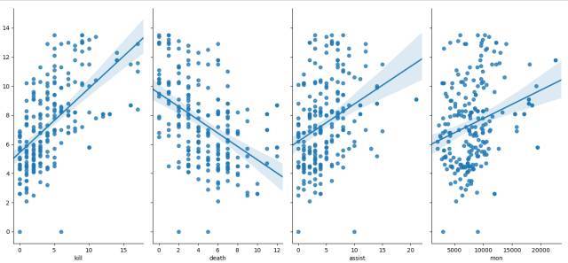 用python的seaborn包作出每个因素与分数的散点图和拟合直线和95%的置信带,如下,从图中可以看出击击杀(kill)、助攻(assist)和死亡(death)都与分数成线性关系,而金币(mon)和分数有一丝丝线性关系,但是不是太显著。