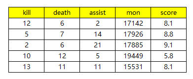 线性方程式为:score=a*kill+b*death+c*assist+d*mon,拟合参数如下,因为金币数太大,所以在拟合时,mon=原金币数/1000,使拟合效果更明显。