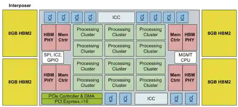 这段文字信息量很大,其中Graphcore的无DRAM设计(Graphcore AI芯片:更多分析),Nervana的2.5D Chip(见下图)大家都比较熟悉了。Western Digital是用Esperanto Technologies(最近刚加到我的AI芯片列表)的RISC-V处理器做AI芯片。这里最值得关注的应该是Cerebras的“wafer-level integration”,据说非常“另类”。由于这家公司一直还是stealth mode,没有公开过技术信息,所以广大群众也只能先等待了。