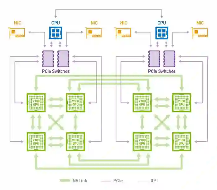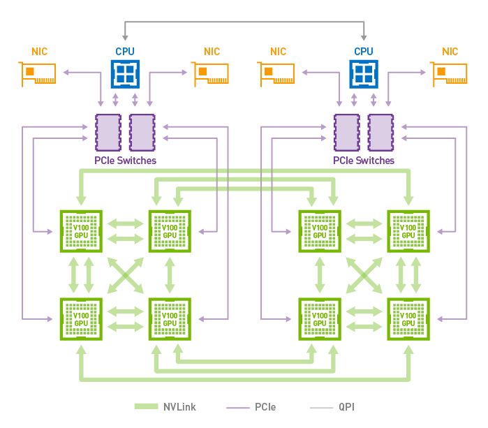 Nervana的一个特色就是所谓flexpoint的数据精度。而对于Server端的training应用,HBM2(High Bandwidth Memory)和多芯片扩展已经是标配了,比如Nvidia Volta支持8颗芯片互连(下图),Google的TPU2也是4颗芯片组成一块板卡来工作。