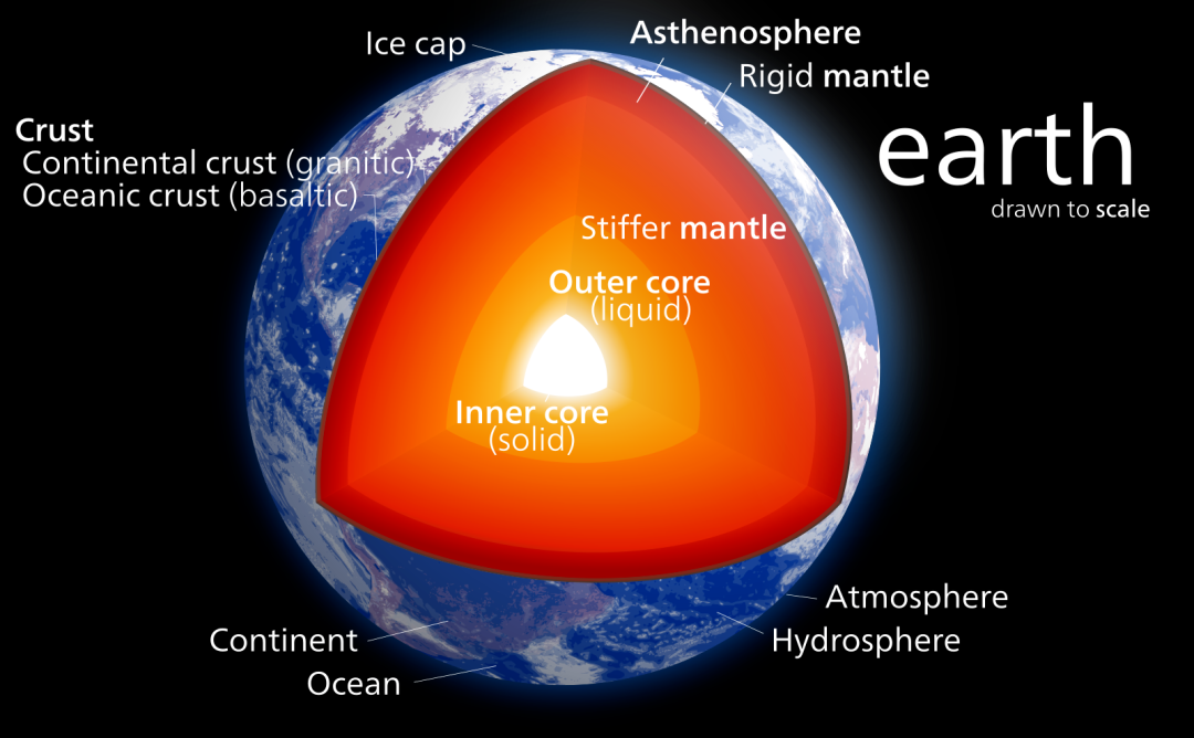 地球是太阳系中由内及外的第三颗行星,主体包括岩石圈、地幔、熔融态金属的外地核以及固态金属的内地核,并拥有由外地核产生的地磁场。