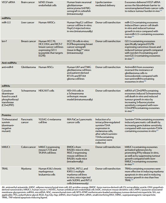 利用EVs作为药物载体用于癌症治疗又有哪些报道呢?继续看下表☟