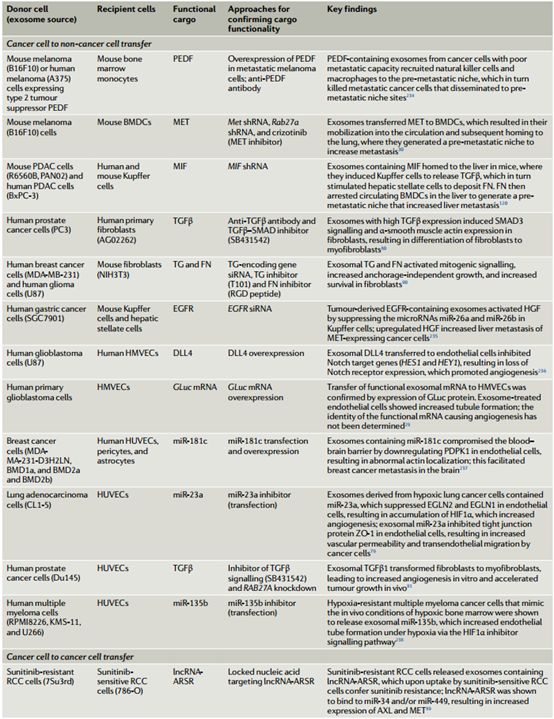 下表:证据支持外泌体成分在癌细胞通讯中发挥作用