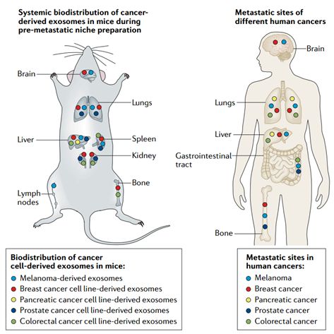 癌细胞外泌体在小鼠和人类常见癌症转移部位的生物分布。