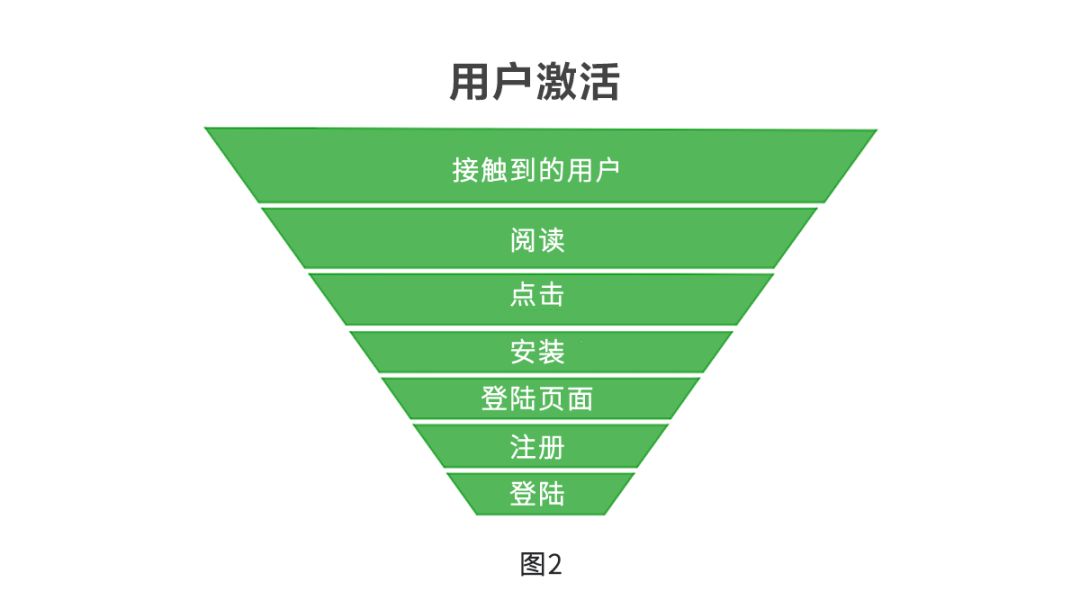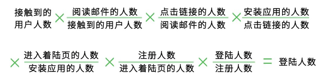 企业可通过多种自有和付费营销渠道接触新用户,图2显示的漏斗模型是邮件渠道的用户激活情况。“接触到的用户”包括所有收到邮件的用户,其中只有一部分会阅读邮件。而点击链接的人中,又只有一部分会完成安装。最终的用户人数还要减去那些安装了应用但未打开登录页面的人数。最终只有一小部分用户会打开注册页面,注册新账号,并最终成功登陆。成功登陆的用户数可用下示简便公式进行计算:
