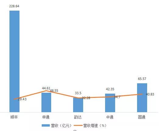 但尴尬的是,即便是看似可观的营收增长,如果进行横向对比,在几大快递公司里却是垫底(考虑到尚有多家公司并未公布2018年报,继续对比2018年三季度业绩)。
