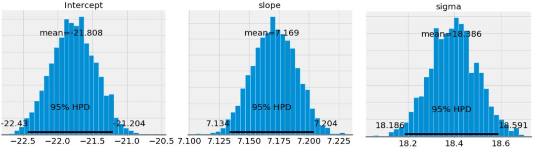 如果我们将斜率和结局的平均值和通过 OLS 得到的相比(OLS 得到的截距为 -21.83 且斜率为 7.17),我们看到这二者得到的结果极为相似。然而,尽管可以使用均值作为一个单次的点估计,但我们还拥有一系列模型参数可能的值。随着数据点数量的增加,这个范围将会缩小并且收敛到一个确切的值,表示对模型参数有更大的置信度(在贝叶斯推断中,一个变量的范围被称为可信区间,这与频率推断中的置信区间的解释稍稍有些不同)。