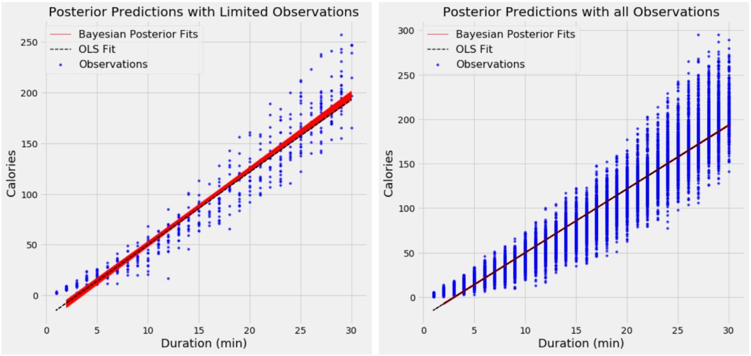 使用 500 个(左图)观测值和 15,000 个(右图)观测值的贝叶斯线性回归模型的结果