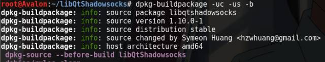 root@Avalon:~/libQtShadowsocks#dpkg-buildpackage -uc -us –b