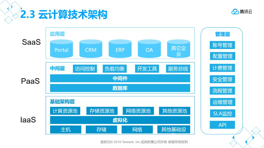 比如腾讯云,既可以交付诸如虚拟机,网络,存储等基础架构资源,提供基础架构方面的服务;也可以交付诸如云数据库,人脸识别等业务应用所需的各种服务平台;当然还提供了企业办公,网络监控,数据分析等应用资源,从而更好的满足和支撑客户的业务扩张。