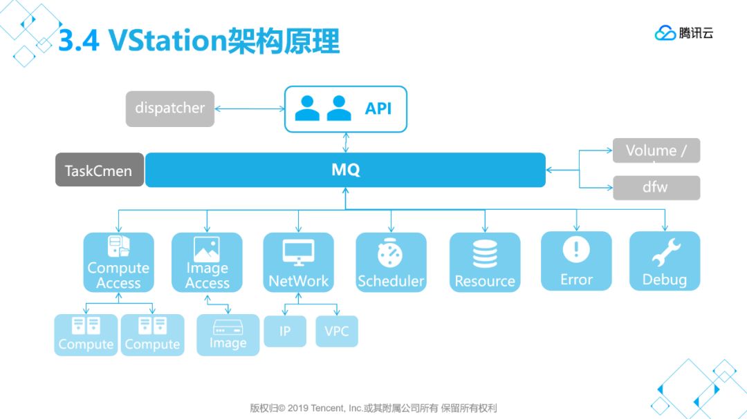 而为了解决超大规模对调度吞吐率带来的挑战,2013 年初,腾讯云自主研发的革命性虚拟化平台 VStation 全面上线。与 OpenStack 相比,VStation 支持数十万台服务器的集群规模,任一模块跨机房部署容灾,并可支持数万台虚拟机分钟级别的创建,其架构图如图所示。在 VStation 架构中存在多种模块,Scheduler 就是其中的一种模块,负责为虚拟机选择合适的宿主机。
