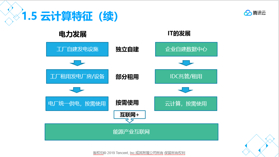 2003 年 5 月年美国尼古拉斯. 卡尔在《哈佛商业评论》发表名为《IT Doesn’t Matter》的文章,将 IT 的发展类比电力的发展,提出 IT 行业将迎来巨大变革,从专业技术向通用能力转变,首次提出像使用电一样使用 IT,云计算是必然趋势。而类比电力发展得 3 个阶段:独立自建 -> 部分租用 -> 按需使用,IT 发展也可分为 3 个阶段自建 DC -> 传统 DC -> 云计算。