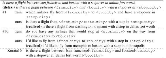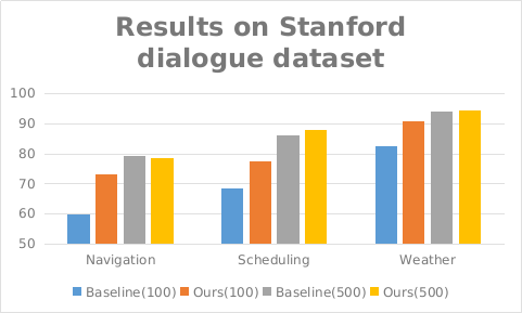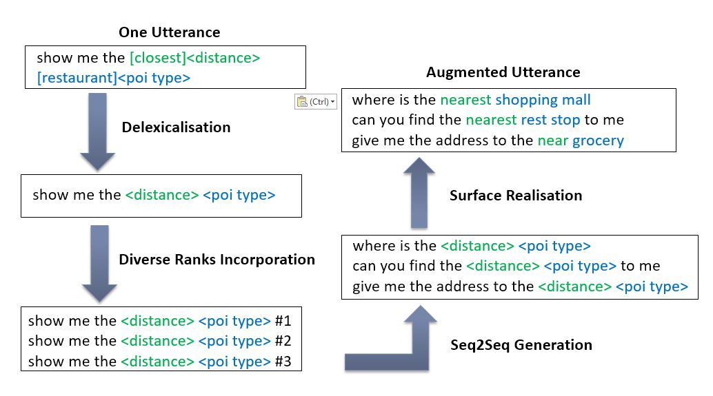 数据增广(Data Augmentation)是通过扩大机器学习系统中训练数据的大小来解决数据不足问题的有效方法。 数据增广在诸如图像分类、语音识别等很多领域取得了成功,但是在任务型对话上的相关研究还很少,据我们所知目前Kurata等人 2016年的工作(Kurata et al. 2016)。Kurata等人在工作中通过给seq2seq的中间表示加入随机扰动的方式生成新的句子。但是他们没有考虑句子之间的关系。
