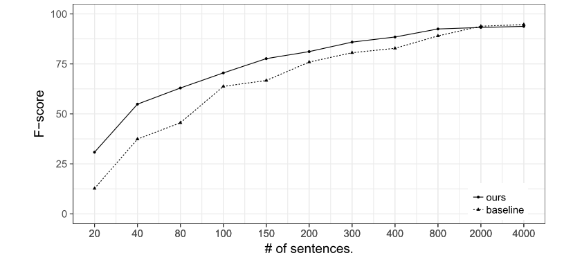 图9. 随着ATIS训练数据规模的变化,我们模型得到的F值的变化情况