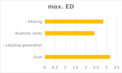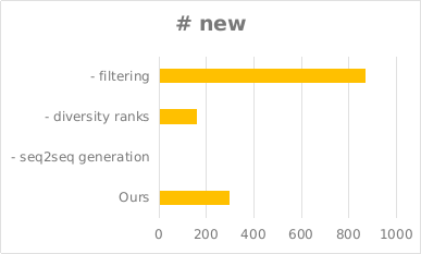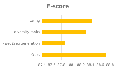 为了探究我们方法的各个组成模块的作用与贡献,我们进行了消融测试,测试结果如下图所示。除了F-score之外,我们还对比了去掉不同组成时模型生成的新语句个数、以及新语句与训练集的最小编辑距离,以反映我们模型生成多样化数据的能力。
