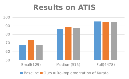 我们在ATIS和Stanford数据上的实验结果如下图所示。我们的基线模型是vanilla BiLSTM的slot 标注模型,我们的数据增强模型使用相同的模型结构,但是使用我们的方法生成的增强数据进行训练。 与基线相比,我们的增强方法显着提高了LU性能,在小比例数据上获得了6.38 F-score提升,在中等比例数据上获得了2.02 F-score提升。
