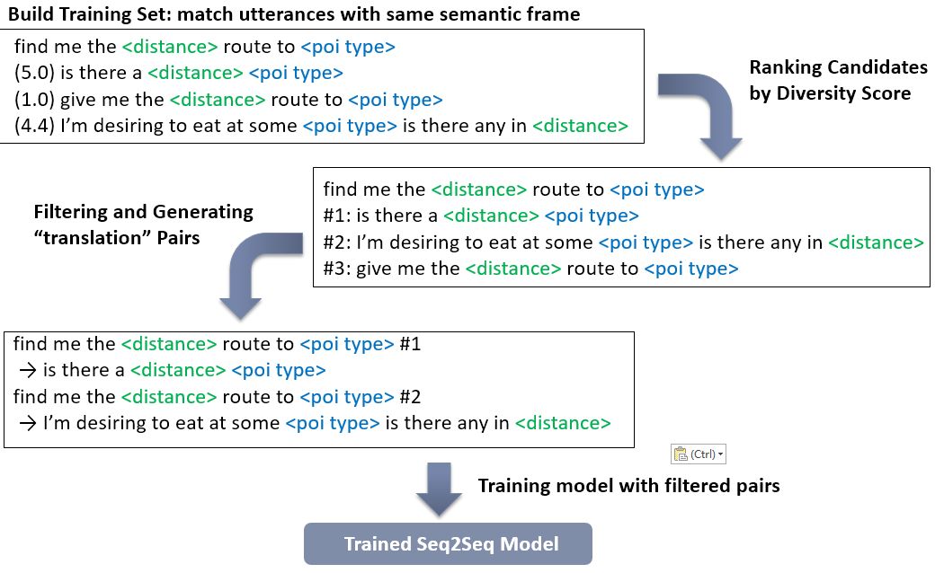 其中的seq2seq的训练流程如图2所示。我们将具有相同语义框架的句子配对,然后计算句子对的多样化分数并以此进行排序作为多样化等级。在使用多样化等级过滤掉相似的句子对后,我们把加上多样化等级的句子对送到seq2seq中进行训练。