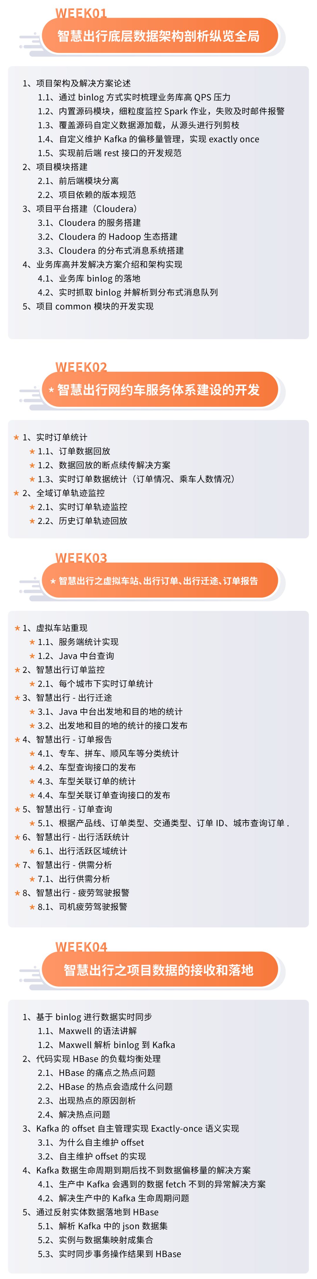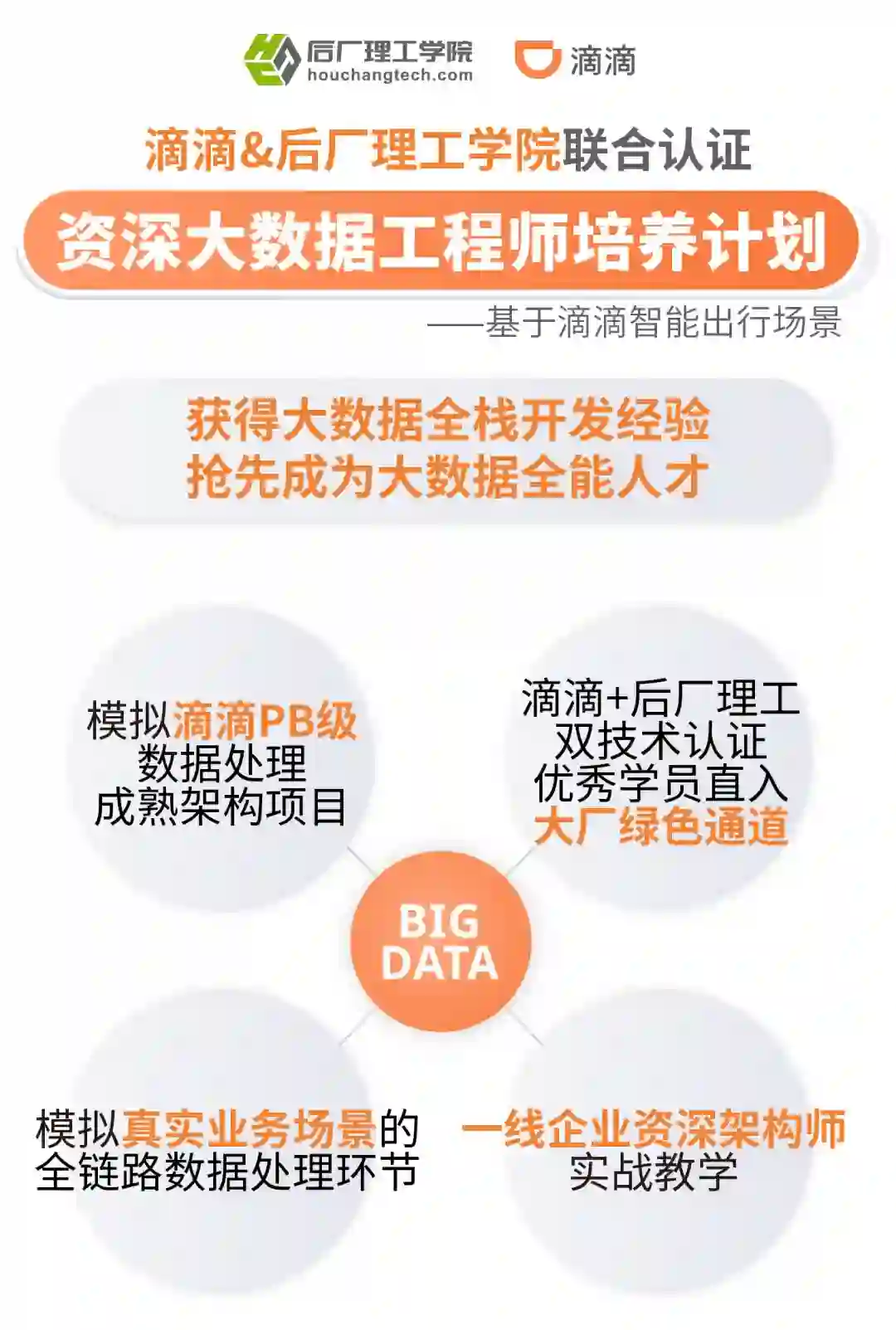 后厂理工学院工程院集结顶级师资力量,基于滴滴智能出行场景,将滴滴盖亚开放数据集和部分开源的深度大数据技术整合为了这门市场上最具深度的大数据课程。