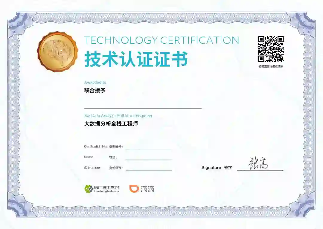 学员修满学分毕业后将获得后厂理工学院与滴滴出行联合颁发的结业证书,一线大厂认可,学习记录及成绩永久可查。