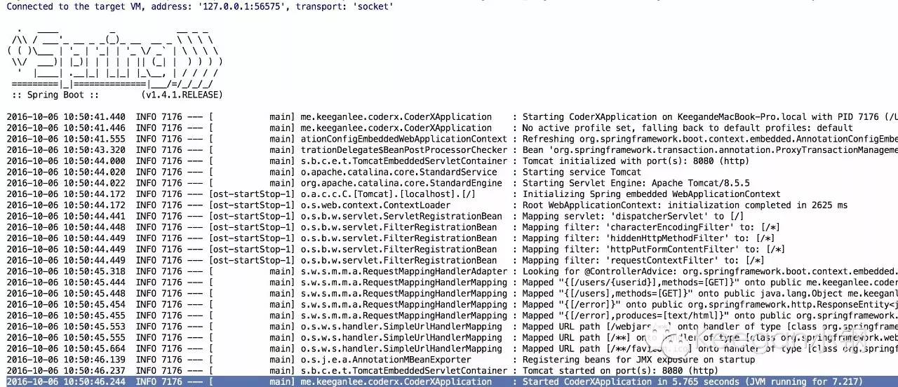 最后一步就是要验证结果了。运行 CoderXApplication 类的 main 方法启动服务。启动成功的话,会打印出如下消息:
