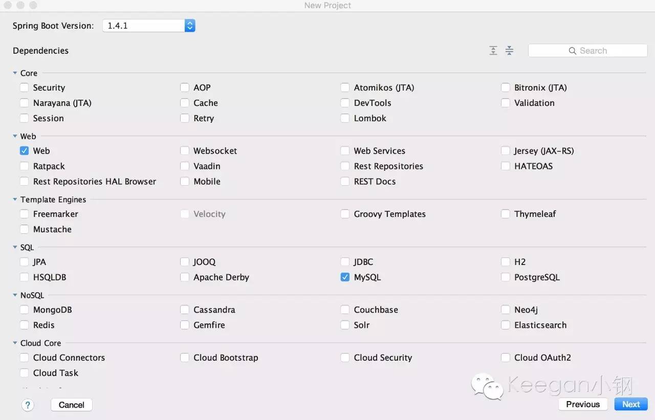 本项目选用了Gradle Project。下一步则可以选择Spring的一些依赖库,我只选择了两项:Web、MySQL。