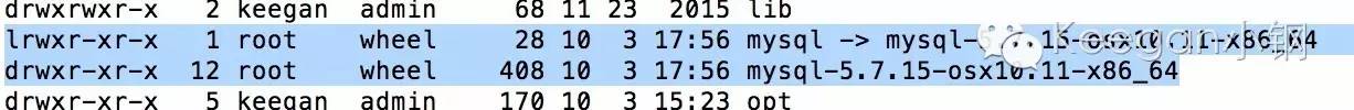 而MySQL的安装位置在 /usr/local/ 下,一个类似于“mysql-5.7.15-osx10.11-x86_64”这样的目录就是安装后的目录,另外还存在一个名为“mysql”的快捷方式: