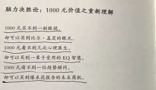 比如,在《脑力决胜论》,李欣频就巧妙的把产品精神利益变成参照物。实物的高价,对比获取精神补给的廉价,强烈的反差对比出要推销的书的价值。