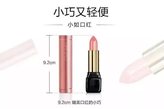 你看,用口红!这个问题直接用一张口红的参照图就解决了,非常直观形象,看的人都知道了这个迷你充电宝好小啊,竟然和口红差不多大小。
