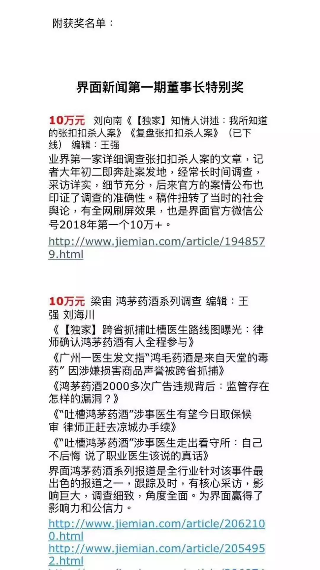 据记者站 昨天,界面·财联社董事长第一期特别奖公示,多组稿件获得10万元奖励,数额之高引发不少业内人士讨论。界面新闻执行总编辑衍阁表示,界面今年准备了1000万奖金,单组(篇)奖励上不封顶。