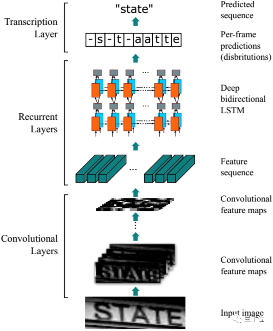 • CRNN-CTC模型,采取CNN+RNN+CTC架构,卷积层使用CNN,从输入图像中提取特征序列、循环层使用RNN,预测从卷积层获取的特征序列的标签(真实值)分布、转录层使用CTC,把从循环层获取的标签分布通过去重整合等操作转换成最终的识别结果。