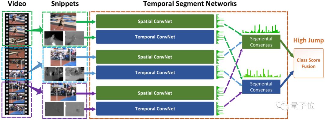 • Temporal Segment Network (TSN) ,视频分类领域经典的基于2D-CNN的解决方案,主要解决视频的长时间行为判断问题,通过稀疏采样视频帧的方式代替稠密采样,既能捕获视频全局信息,也能去除冗余,降低计算量。最终将每帧特征平均融合后得到视频的整体特征,并用于分类。