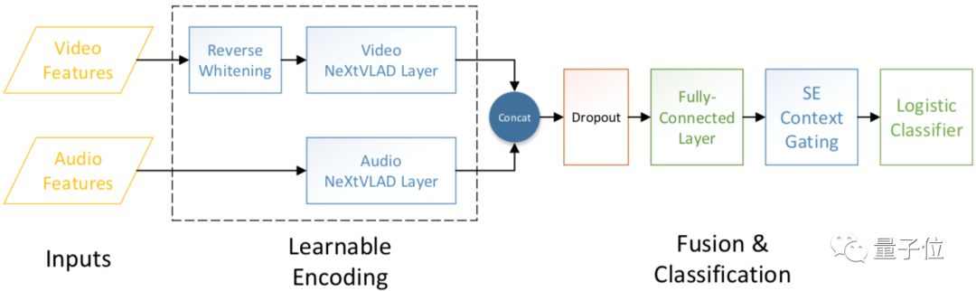 • NeXtVLAD模型,第二届Youtube-8M视频理解竞赛中效果最好的单模型,提供了一种将桢级别的视频特征转化并压缩成特征向量,以适用于大尺寸视频文件的分类的方法。其基本出发点是在NetVLAD模型的基础上,将高维度的特征先进行分组,通过引入attention机制聚合提取时间维度的信息,这样既可以获得较高的准确率,又可以使用更少的参数量。