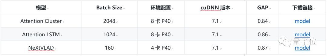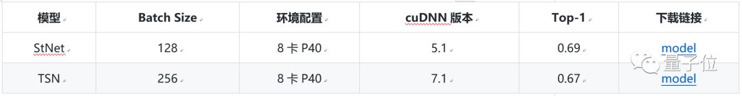 Attention LSTM模型速度快精度高,NeXtVLAD是2nd-Youtube-8M比赛中最好的单模型, TSN是基于2D-CNN的经典解决方案。Attention Cluster和StNet是百度自研模型,分别发表于CVPR2018和AAAI2019,是Kinetics600比赛第一名中使用到的模型。